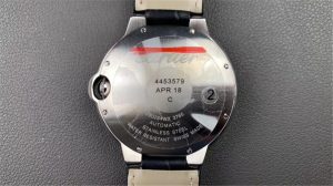 藍色指針做工,V6不只是顏色和材質(zhì)一樣,時針、分針、秒針都是跟原廠長度、粗細達成一致。7點鐘的羅馬數(shù)字字面方向,鐫刻著卡地亞的logo,以及羅馬數(shù)字的刻度都是用墨水印花填上的,不是扁平的數(shù)字,它們會有一點立體感,表面比較光滑,還有一點飽足感。三點鐘的位置設置了魚眼日歷窗口,通過日歷放大鏡來觀看數(shù)字,紋理是一級棒。只有42MM藍氣球具有日歷窗顯示功能,使腕表更具實用性。
