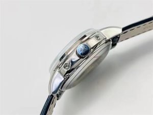 ?直徑40毫米一體沖壓成型的雙層式精鋼表殼,致敬了經(jīng)典的設(shè)計語言奶油色的表盤營造復古氛圍,表盤邊緣刻印有密分秒數(shù)刻度,配金質(zhì)阿拉伯數(shù)字及五分鐘凸圓刻度字釘,更有立體感。時分指針以巴頓式設(shè)計為基礎(chǔ),配以尖長的針尖,這特色造型是呼應(yīng)了 1950 年代 Ref. 1463 計時碼表的指針。?表盤6點位置是月相顯示和日期分撥。所有的萬年歷標志都很好,一眼就能讀懂。內(nèi)里搭置了仿324 S Q 自動上鏈機芯,是 324 自動上條傳奇機芯的精裝版本。機芯夾板橋經(jīng)倒角,邊緣作細意打磨,主夾板飾以魚鱗紋,而夾板則綴以日內(nèi)瓦波紋,夾板表面有包金雕刻,螺絲凹槽經(jīng)打磨和倒角,連鉆孔亦同樣經(jīng)打磨處理。搭配朱古力啡色牛皮表帶,進一步帶出復古氣息。