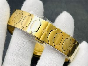 5??表帶:采用一體式六邊型中央鏈節(jié)讓整表更顯棱角分明,同時又不失雋永優(yōu)雅的美感6??固定表扣采用雙鎖系統(tǒng),保證佩戴的安全性和舒適度。搭配精致的拼接皮革表帶,展現(xiàn)高貴典雅的風(fēng)格。