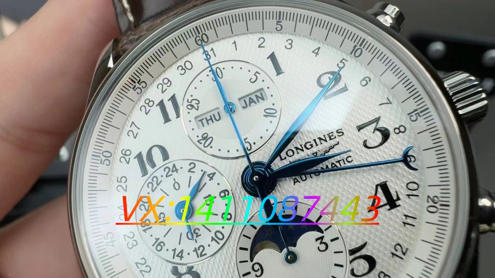 GS 廠浪琴八針月相腕表的鏡面采用藍(lán)寶石材質(zhì),通透度與正品不相上下。與白色盤面相互映襯,整體質(zhì)感盡顯。從盤面上,月相、計(jì)時、全歷顯示、24 時等諸多復(fù)雜功能布局精巧,呈現(xiàn)出絕佳的視覺效果,淋漓盡致地展現(xiàn)了浪琴卓越的制表技藝。