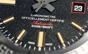 字面上的第一感覺是非常干凈細致。字跡清晰,12點的百年靈logo它非常三維,看起來不錯。字體是一致的,字母是一致的。指針也使用瑞士的非常發(fā)光作為表盤。經(jīng)過無數(shù)次的調(diào)整,表盤的粒度最終與原來的粒度相同。在三點鐘的位置,在紅色的日歷窗口中,與內(nèi)部黑色陰影刻度對應(yīng)的字面刻度非常整潔。可以看出,字面上的中心孔也經(jīng)過了精細的拋光,形成了一個沒有倒鉤的弧形。瑞士進口指針長度、指針和表盤刻度上的有光涂層C3發(fā)光粉,發(fā)光效果飽滿圓潤。第二針尾端為紅色,GF工廠注意到中心軸的所有細節(jié)都是空心的。指針的細節(jié)得到了很好的控制。沒有缺失的點或黑色層接觸到明亮的層。單向棘輪旋轉(zhuǎn)表圈與四個表圈指示器一致,使操作更加方便,確保最終準(zhǔn)確的飛行和潛水時間。
