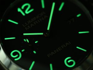 棕黑色的表盤,是三明治夾層結(jié)構(gòu),這屬于沛納海的專利,就是說夜光涂層夾在中間,避免了夜光溢出,同時在黑暗處更亮。表盤使用磨砂處理,看起來質(zhì)感極強,手表刻度除開6,9,12點位均是鏤空的條丁!小三針的盤面設計,劍形的時針和分針上有夜光,9點位置的小秒盤用于秒針走動,同樣有夜光。表盤12點位置下方和6點位置上方油印的沛納海字樣有輕微的立體感。整個表盤看起來簡潔大方,具有運動的美感!