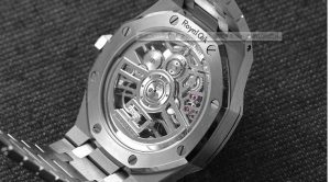 從另一個(gè)角度來(lái)看,鏤空手表也是品牌對(duì)機(jī)芯打磨自信的一種展示方式。從這張近距離圖來(lái)看細(xì)節(jié),整個(gè)機(jī)芯的打磨和表殼一樣,正面深拉絲,邊緣倒角拋光。不僅如此,機(jī)芯部件還經(jīng)過(guò)了不同的工藝裝飾,如環(huán)紋、放射紋打磨、蝸形紋處理等,AP還介紹了手表的正反面,可以看到20多個(gè)手工拋光的V形倒角。