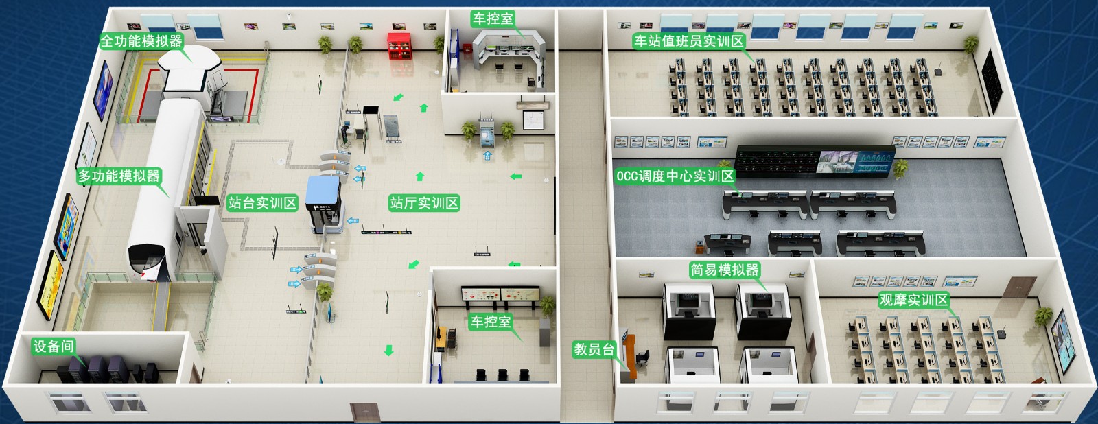 城軌全自動運行綜合仿真培訓系統旨在解決當前城軌領域全自動運行中各專業單工種實作技能培訓及多工種協同演練技能培訓缺乏安全、高效、適用工具的問題。系統具有完全自主知識產權,基于全自動運行系統 GoA3、GoA4級運行原理仿真,能夠滿足全自動運行場景下各崗位人員的培訓考核需求。城軌全自動無人駕駛仿真培訓系統主要由調度作業仿真培訓系統(含車輛調、乘客調、行調、電調、環調仿真培訓終端)、車站作業仿真培訓系統(含站臺站廳實訓系統)、列車駕駛仿真培訓系統等核心系統組成。