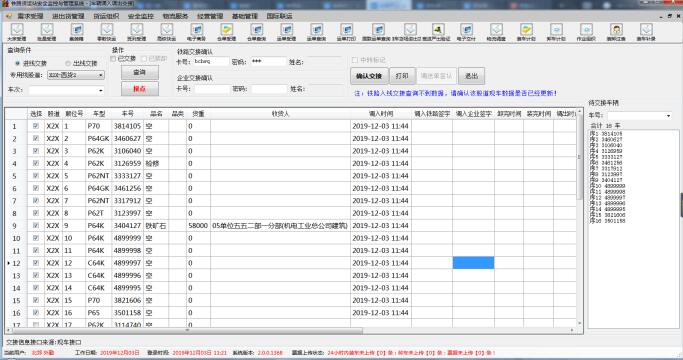 為加強(qiáng)專用線、專用鐵路貨物運(yùn)輸管理,進(jìn)一步提高專用線管理水平及貨運(yùn)服務(wù)質(zhì)量。我公司研發(fā)的專用線交接系統(tǒng),對(duì)進(jìn)出專用線車輛自動(dòng)識(shí)別車號(hào),保存車輛影像資料,機(jī)檢信息傳入貨運(yùn)站系統(tǒng),為路企交接提供依據(jù),并生成貨車調(diào)送單,避免了路企雙方對(duì)貨車延時(shí)占用費(fèi)的意見和分歧。可查詢專用線電子臺(tái)賬,同時(shí)采用無(wú)線手持機(jī)進(jìn)行數(shù)據(jù)時(shí)事跟蹤,及時(shí)辦理車輛進(jìn)出。